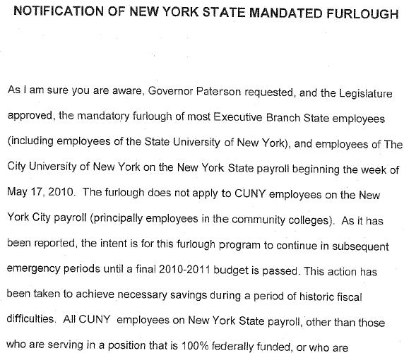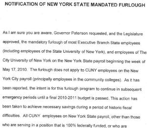 Today faculty received notices that the NY legislature enacted and the government signed a furlough of state workers. That includes our professors at Baruch. Soon enough the unions (including PSC to which same professors belong) filed for a restraining order. Judge Kahn in district court issued the order this afternoon according to the New York Times.