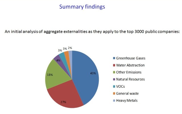Why is knowing that GHGs and water use make up 70 % of the externalities produced by the top 3000 public companies important?  Combine this fact above with a second one:  If these companies had to pay for the cost of the pollution and ecological damage from these externalities it would decrease these companies’ profits by more than one third.